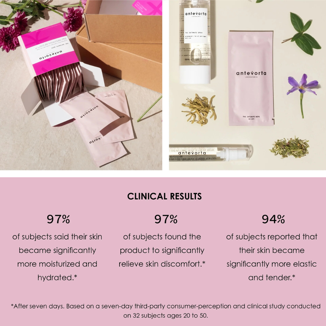 Antevorta Intimate Wipes are your secret to feeling fresh and clean all day long. These portable cleansing wipes are formulated to help neutralize odor, moisturize vulva skin, and maintain good feminine hygiene. Since they are pH-balanced and formulated for safe everyday use, they ensure no dryness, itchiness or irritation, and they won’t mess with your natural vaginal pH.