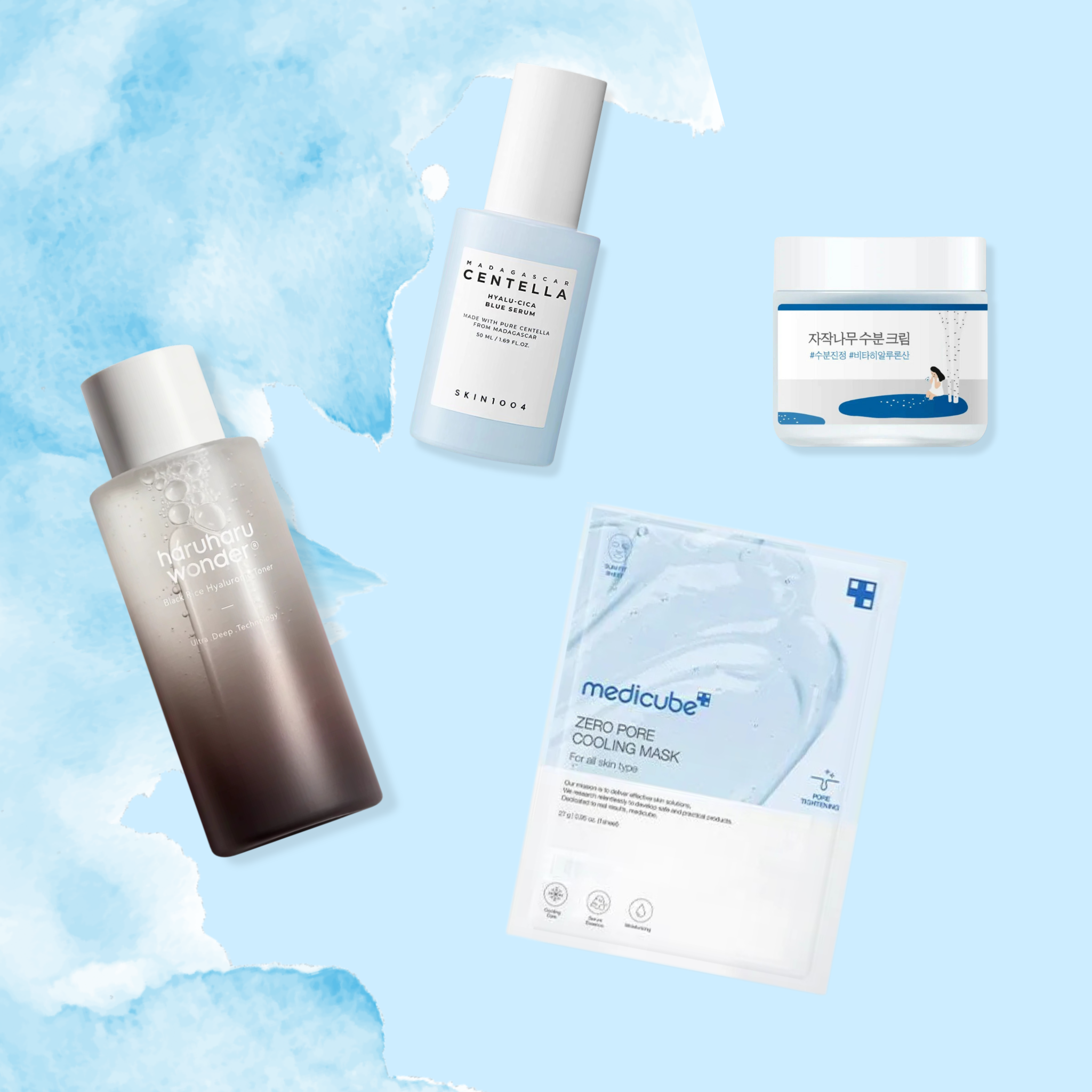 Madagascar Centella Hyalu-Cica Blue Serum: Purified Water, Centella Asiatica Leaf Water (38%), Butylene Glycol, 1,2-Hexanediol, Niacinamide, Glycerin, Pantolactone, Hibiscus Esculentus Fruit Extract, Sodium Hyaluronate, Hydrolyzed Hyaluronic Acid, Hyaluronic Acid, Methylpropanediol, Panthenol, Cetearyl Olivate, Carbomer, Arginine, Sorbitan Olivate, Caprylic/Capric Triglyceride, Pyrus Communis (Pear) Fruit Extract, Pentylene Glycol, Adenosine, Polyglutamic Acid, Rosa Damascena Flower Water, Artemisia Princeps Leaf Extract, Cucumis Melo (Melon) Fruit Extract, Iris Florentina Root Extract, Ethyl Hexyl Glycerin, Hedera Helix (Ivy) Leaf/Stem Extract, Sodium Phytate, Xanthan Gum, Maltodextrin, Hydrolyzed Gardenia Florida Fruit Extract, Hydrogenated Lecithin, Ceramide-NP, Sodium Hyaluronate Crosspolymer, Hydrolyzed Sodium Hyaluronate.