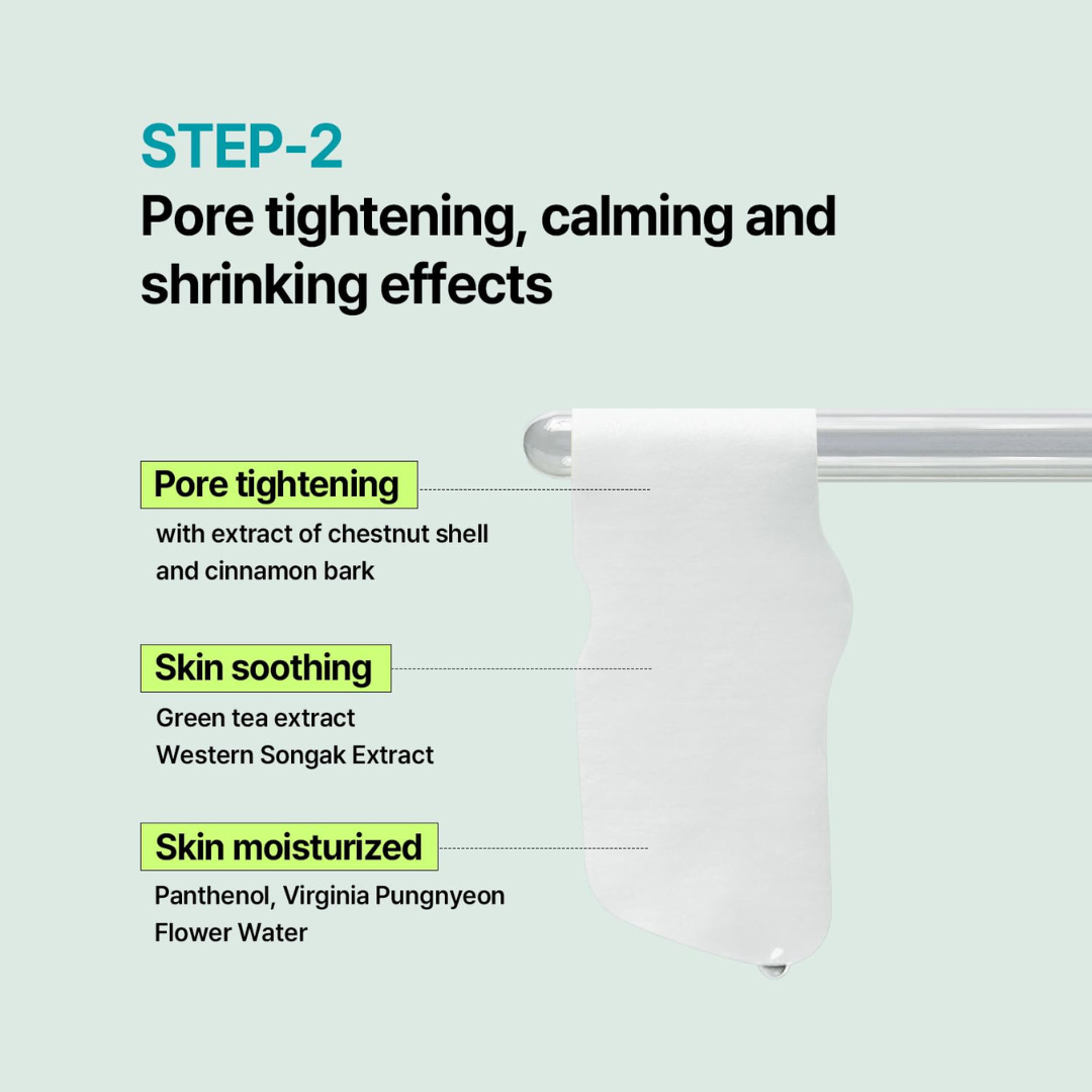 • Step 2: Soothe & Shrink (Pore Tension Mask) After extraction, this second patch delivers a cooling essence to help calm redness, replenish moisture, and visibly minimize the look of pores for a refined finish.
