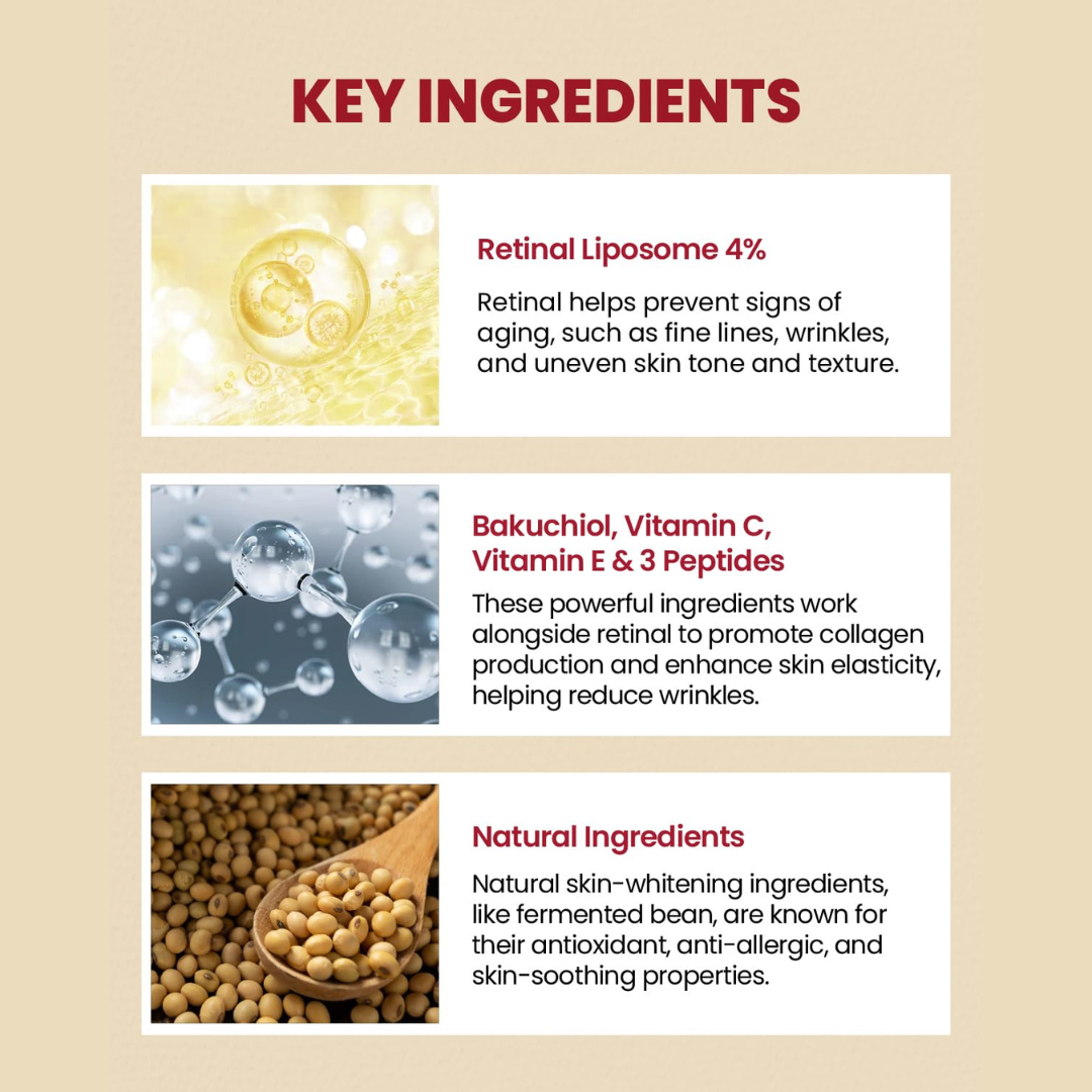 Water, Glycerin, Dipropylene Glycol, Caprylic/Capric Triglyceride, 1,2-Hexanediol, Butylene Glycol Dicaprylate/Dicaprate, Niacinamide, Pentaerythrityl Tetraethylhexanoate, Cetearyl Alcohol, Butylene Glycol, Cetearyl Olivate, Sorbitan Olivate, Hydrogenated Lecithin, Macadamia Ternifolia Seed Oil, Carbomer, Tromethamine, Propanediol, Glyceryl Stearate, Cholesterol, Polyglyceryl-10 Oleate, Ethylhexylglycerin, Adenosine, Brassica Campestris (Rapeseed) Sterols, Phytosteryl/Behenyl/Octyldodecyl Lauroyl Glutamate, Retinal, Silica, Disodium EDTA, Aluminum/Magnesium Hydroxide Stearate, Lactobacillus/Panax Ginseng Root Ferment Filtrate, Lactobacillus/Rice Ferment, Lactobacillus/Soybean Ferment Extract, Saccharomyces/Coix Lacryma-Jobi Ma-yuen Seed Ferment Filtrate, Saccharomyces/Potato Extract Ferment Filtrate, Tocopherol, Potassium Cetyl Phosphate, Pentaerythrityl Tetra-di-t-Butyl Hydroxyhydrocinnamate, Sodium Hyaluronate, Arctium Lappa Root Extract, Cnidium Officinale Root Extract, Dioscorea Japonica Root Extract, Paeonia Suffruticosa Root Extract, Rehmannia Chinensis Root Extract, 3-O-Ethyl Ascorbic Acid, Bakuchiol, sh-Oligopeptide-1, sh-Oligopeptide-2, sh-Polypeptide-1